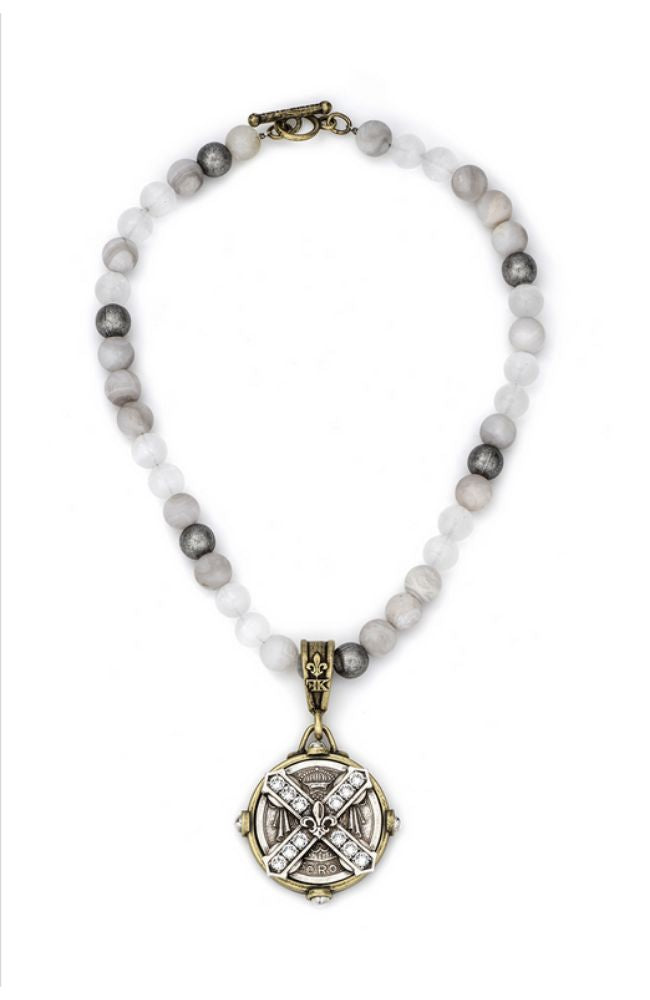French Kande 17" Double Strand Ashen Silk Mix Linkage Croix Medallion