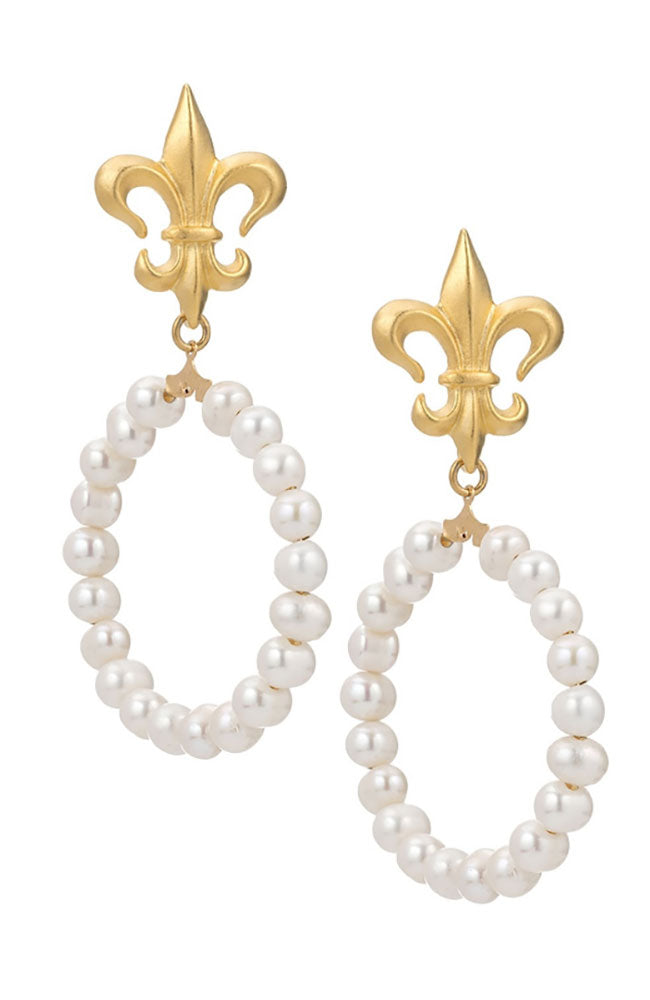 These hoop earrings feature white Freshwater Pearls along the hoop and Fleur pendant studs. Absolutely beautiful all by itself or paired with our other designs.
