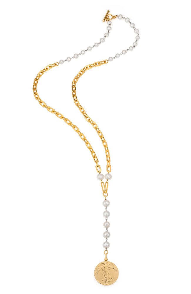 This necklace features 32” of white Freshwater Pearls with silver wire and Honfleur chain, Versailles loops and L’Ange medallion. Absolutely beautiful all by itself or layered with our other designs.