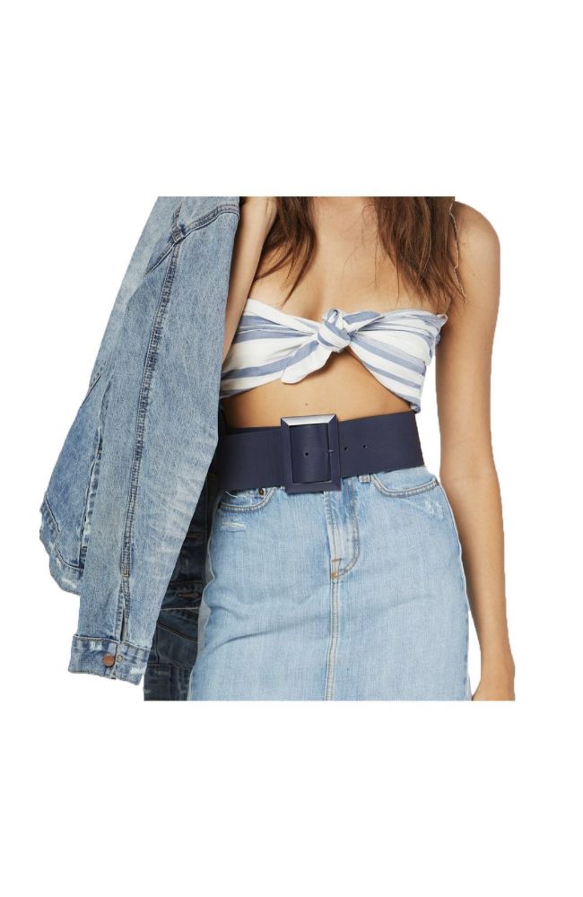 The Alba from B-Low the Belt is a wide leather belt with an oversized covered buckle.