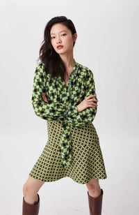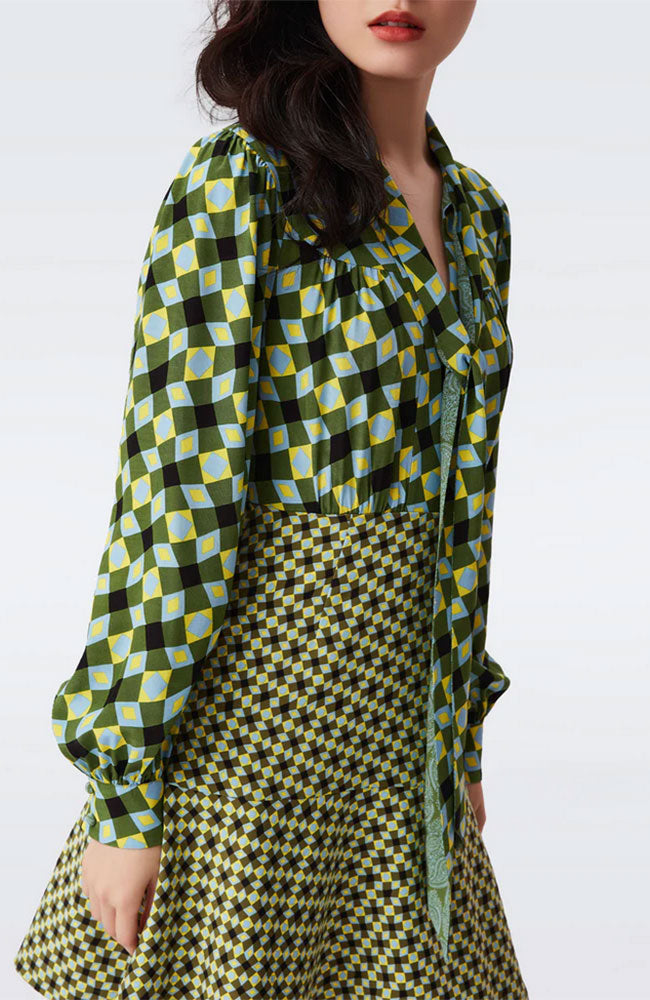 Get the feel of a full outfit with just one piece thanks to the Alcina's print-blocked design. This mini dress has long sleeves and a neck-tie detail that can be customized to your liking.