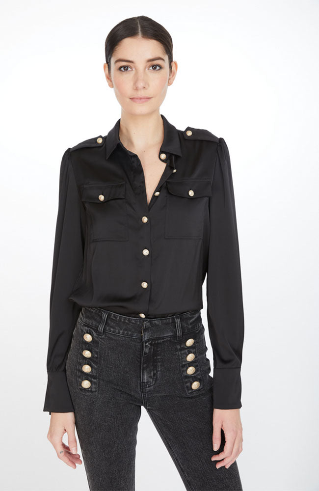Luxurious vegan silk button down shirt with light gold embossed laurel wreath buttons on front, faux pockets, and epaulettes.