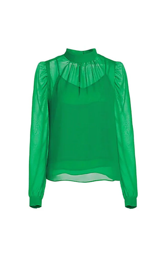 Effortless, elegant and timeless this luxurious silk charmeuse raglan blouse with sheer sleeves, will work with most anything in your closet.