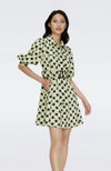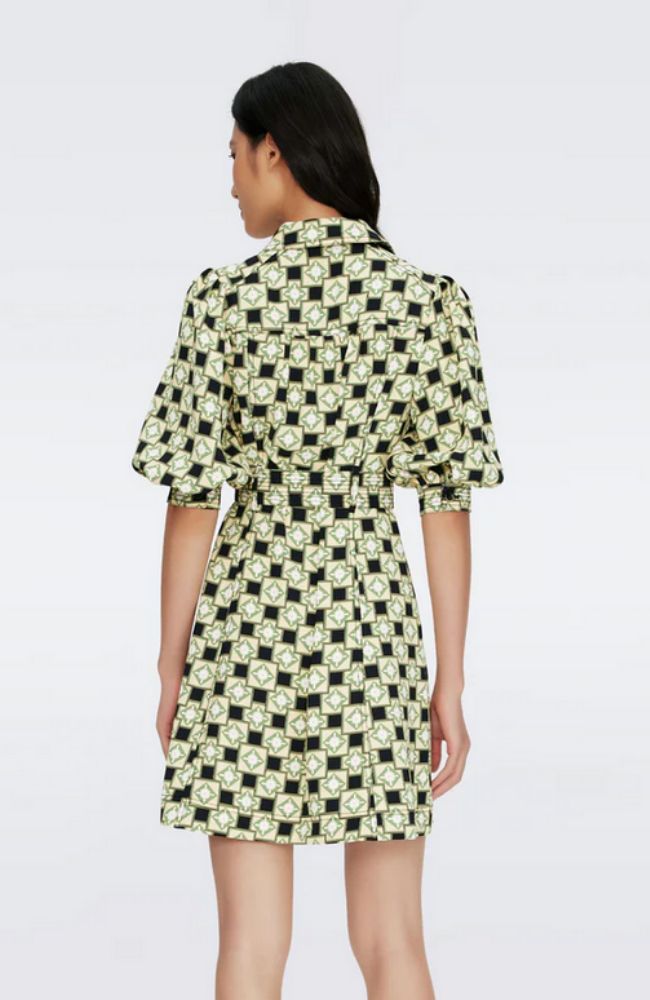 The Britney dress is cut from a crisp fabric with stretch. This piece has puffed half-sleeves that cinch above the elbow and a matching belt that shows off the waist. A shirt dress design, it features a classic collar and fabric-button closure down the center. Did we mention it has pockets?