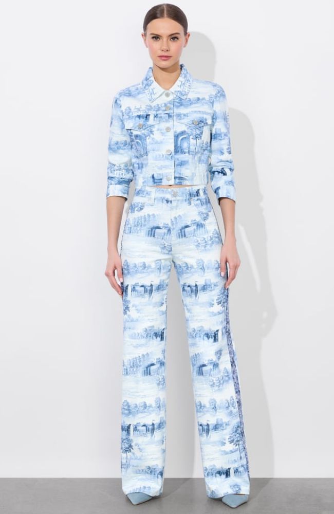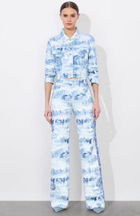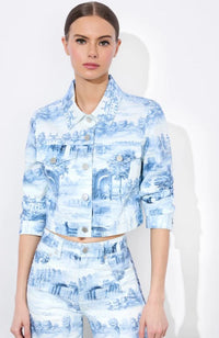 Printed with a striking Renaissance motif, this jean jacket will make a statement everywhere it goes. It is made from premium denim and tailored for a slightly cropped, boxy fit. Silver buttons, two patch pockets and a collared placket give it structure. Lean into its maximalist vibes and pair the Chloe with its matching Weezy jeans. You’ll look like you just stepped off a runway.