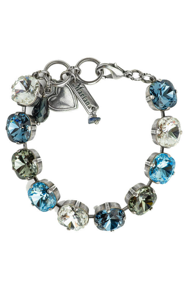 Cushion cut bracelet, hand set with 10 12mm Swarovski Crystals. Includes 3 charms: polished heart, small Swarovski briolette, and Mariana branded tag.