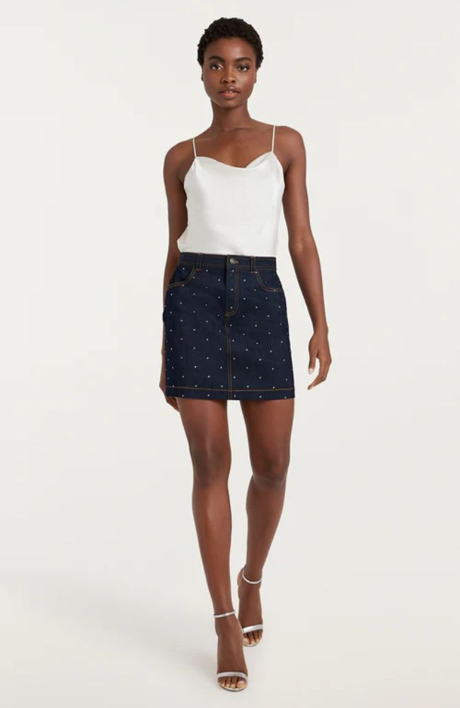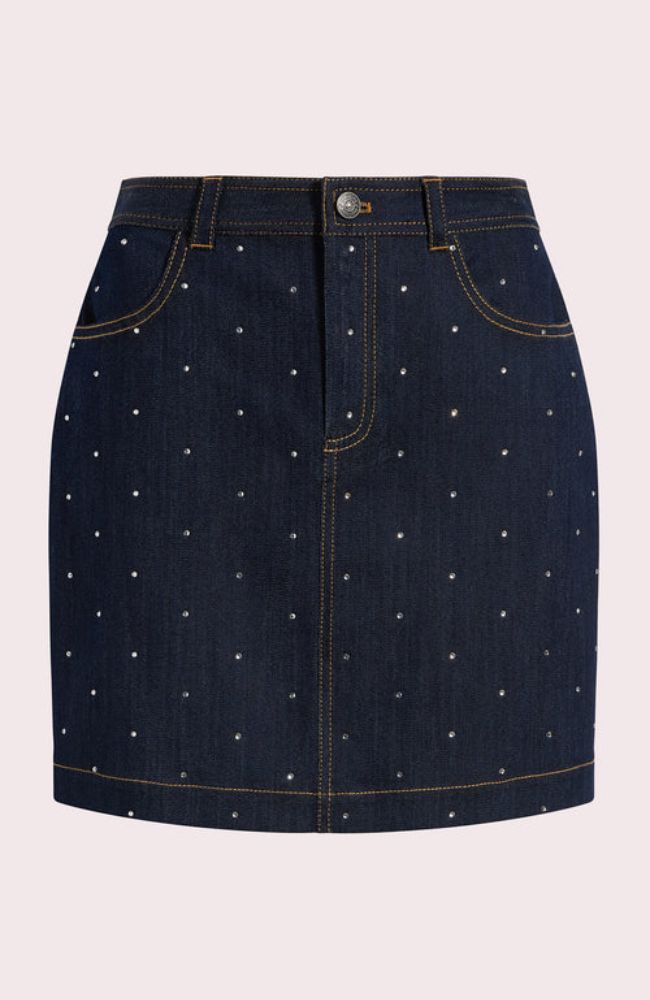 Let the Ditsy Rhinestone Lynette Skirt sparkle you into a new world of style! Speckled with shimmering crystals and crafted with contrasting stitching, this A-line silhouette lets you stand out while four pockets keep you feeling confident and secure. Are you ready to step into the spotlight?