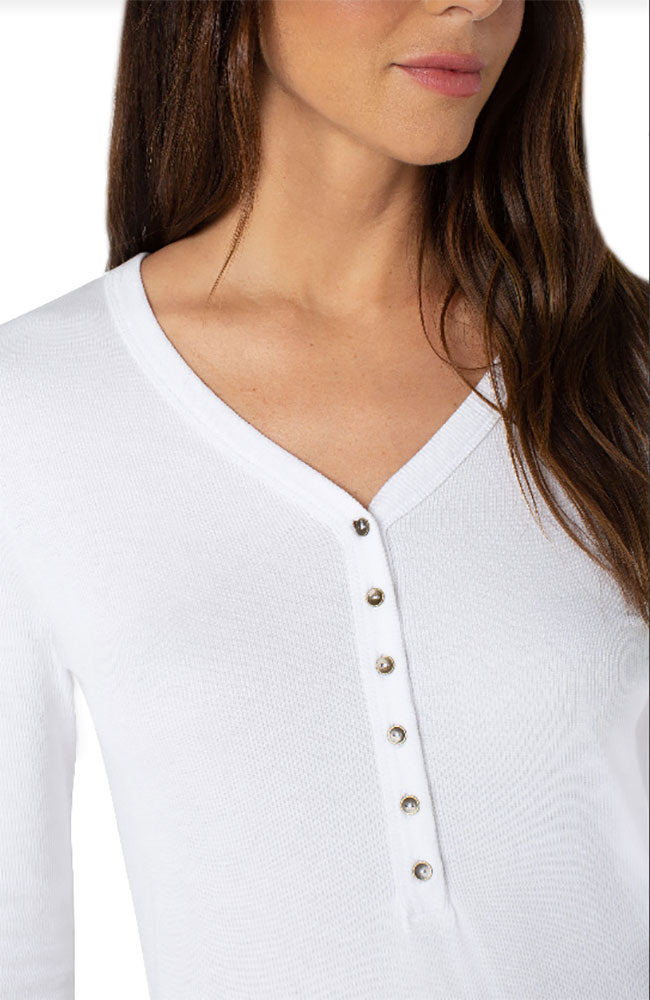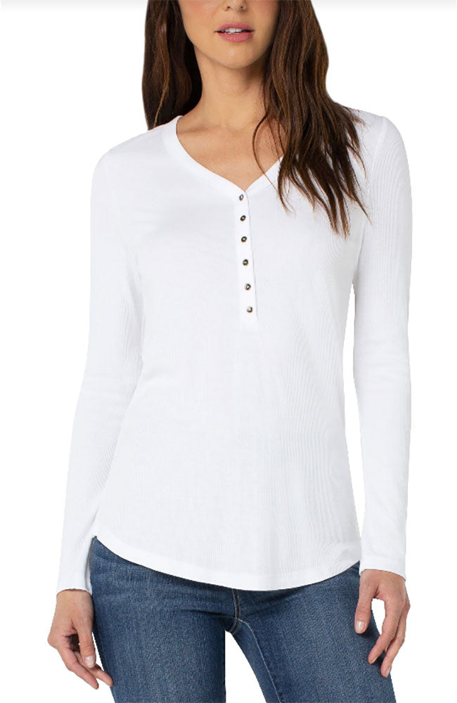 The perfect long sleeve henley in our 2x2 mini rib knit. Super comfortable and easy to layer. The rounded hem finish gives you the option to front tuck or let the hem out.