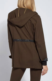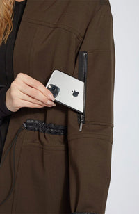 This legging-friendly jacket, crafted from 4-way stretch Ponte, offers meticulous construction and functionality. The Hibernation Hooded Parka showcases a functional sleeve phone pocket with zipper, side pockets, zip front, adjustable drawstring waist, and Faux Leather Black Snake trim for easy pairing. Inside it’s finished with contrast-color binding with the yoke lined in mesh for extra stretch. Showcase this hooded jacket over black leggings and our Festival Mixed Media Top.