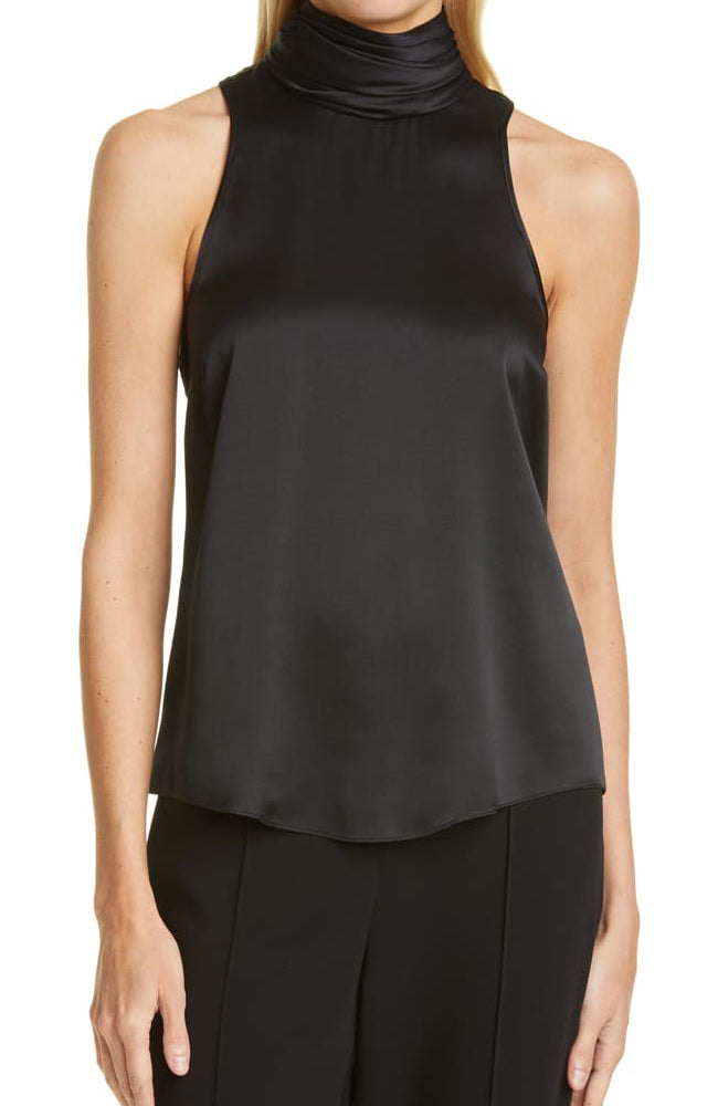 The Jazlyn top form Cinq a Sept is a breezy silk tank cut with a high neckline and back button closure.