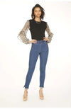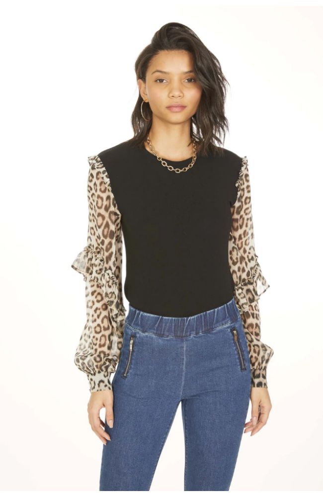 Sweater knit body with leopard silk ruffle balloon sleeve. Slim fit.