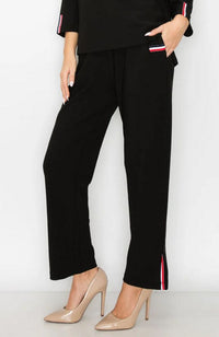 The stylish and comfy Karine pant. Made with high quality stretch crepe knit. Stretchy elastic waist for the perfect fit. Side pockets. Side bottom open slits with contrasted stripe accents. Easy relax fit.