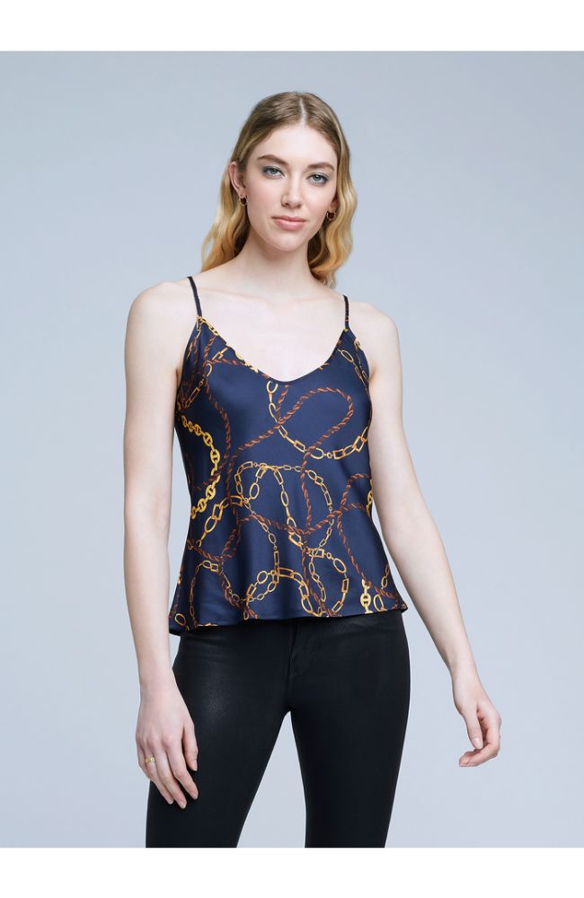 A gorgeous camisole in midnight blue with gold lasso chain details. Bias cut softly drapes and enhances the figure. Includes bias-bound V-necks and armholes that emphasize the clean silhouette. Back V-neck dips to mid-back. Includes adjustable spaghetti straps. Beautiful on its own or as a base layering piece.