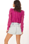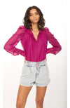 Add a bohemian inspired statement blouse to your everyday wardrobe with an extra dose of glam. The Lou offers a soft touch georgette fabric and flowy body that are easy to tuck into your favorite blue jeans or structured Riley Vegan Leather Joggers. Using the barely-there front ties, the neckline can be worn as a deep-V or tied up into a keyhole shape.