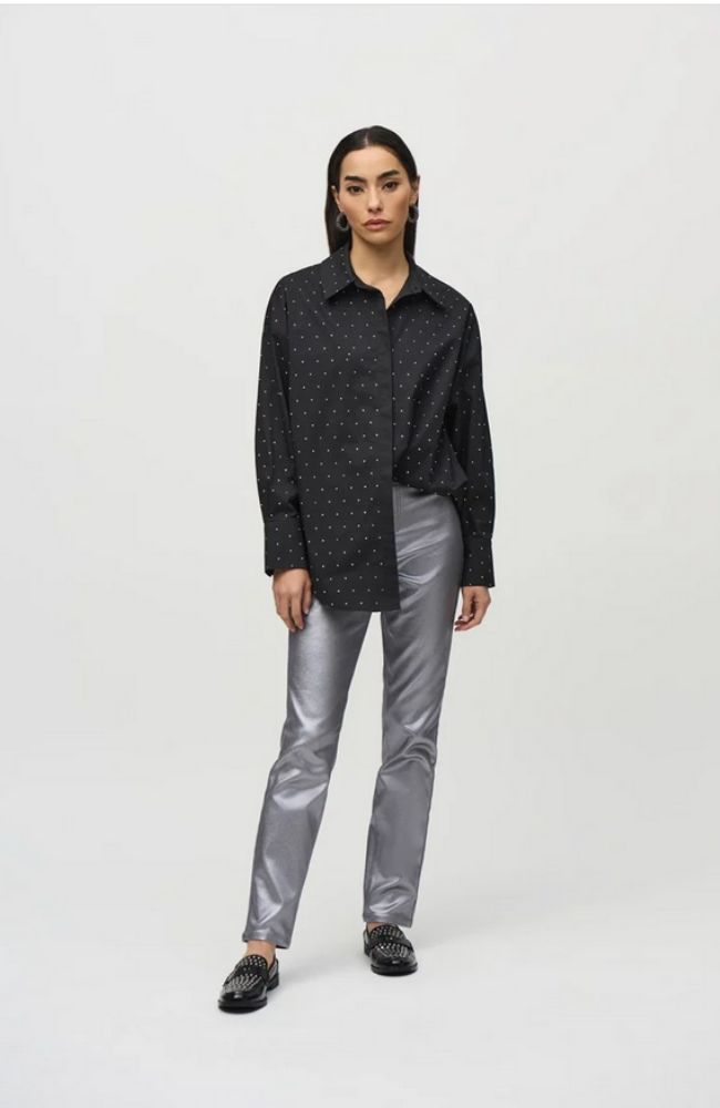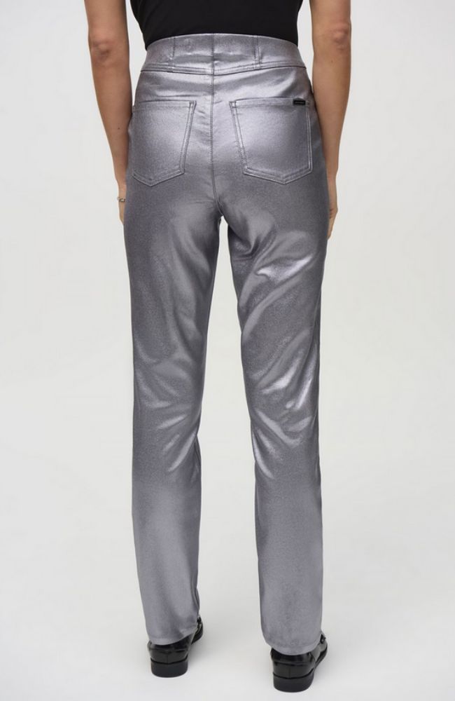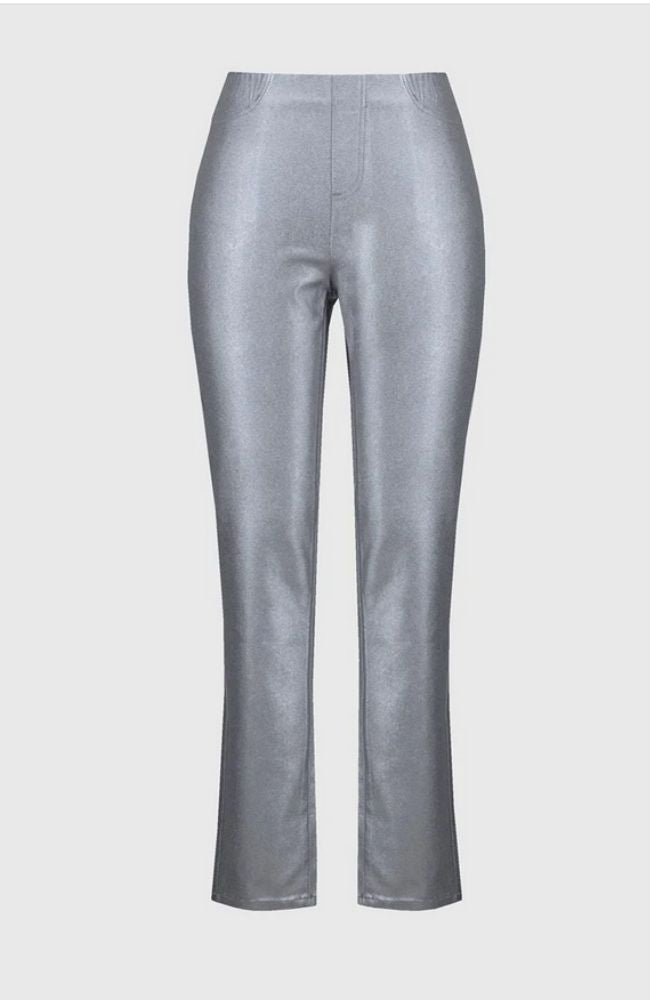 Elevate your denim game with these timeless slim pants, transformed by a metallic coating and a discreet elastic waistband for added comfort. The ideal choice for a glamorous and enjoyable night out.