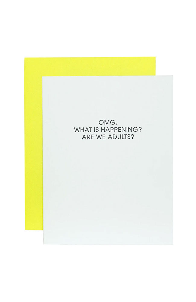 Our "OMG Are We Adults" birthday card is letterpress printed on a vintage printing press.
