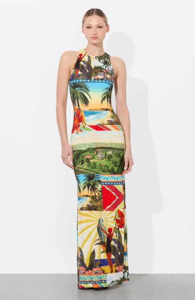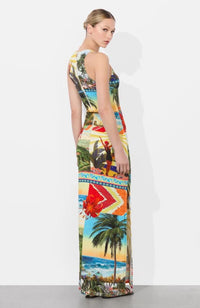 Made for sun-drenched getaways and balmy nights, this high neck maxi dress is a body-hugging beauty in our bold Island Dreams print. The stretch fabric molds to your shape with a high slit for added drama and movement. The back zip keeps the silhouette clean, while the print brings the party. Just add gold hoops and your destination of choice.