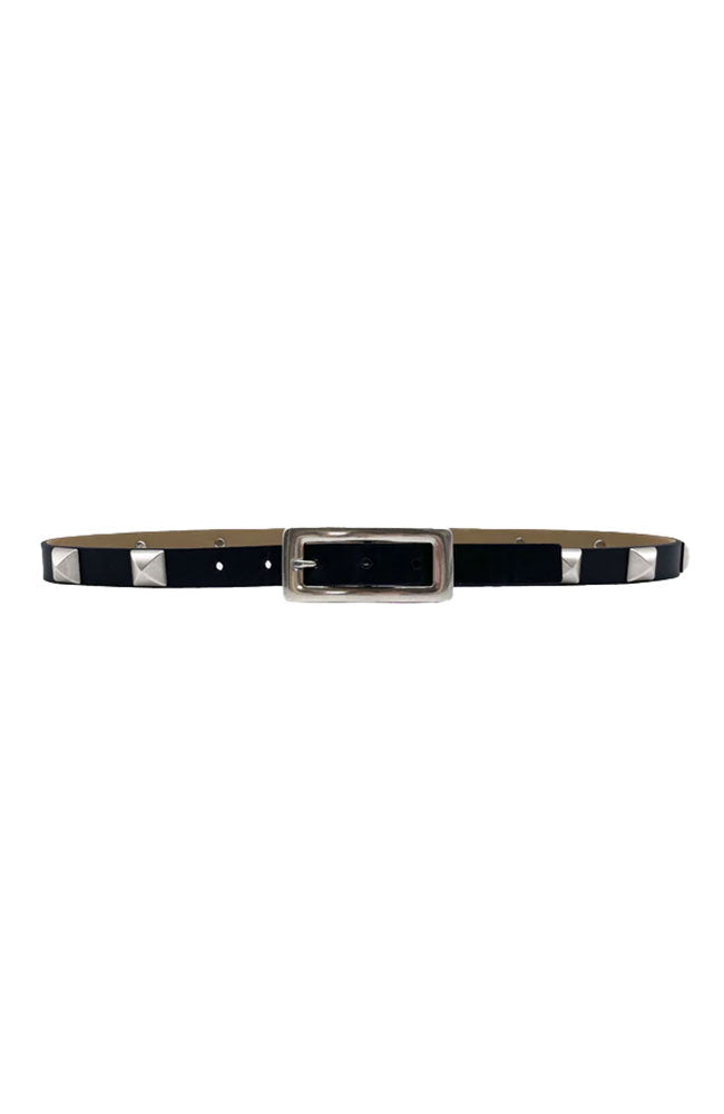 Skinny smooth black Italian leather belt detailed with matte silver pyramid hardware and center bar buckle