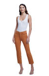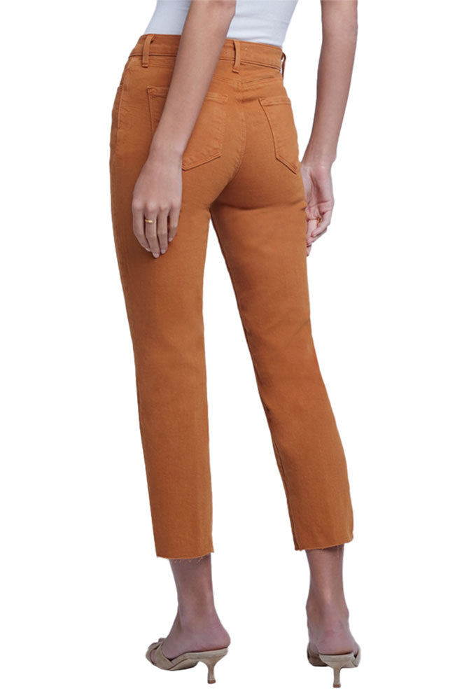 An indespensible high-rise cropped jean in golden honey brown. With classic five-pocket construction, the style also includes a slim straight leg finished with a clean raw hem. Chic tonal topstitching and zip fly closure.