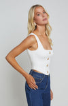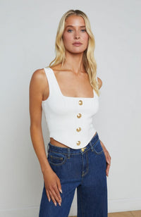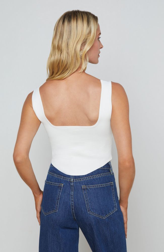 The perfect little ivory top in a power knit that supports and smooths the figure, finished with a curved hemline that flatters and forgives.