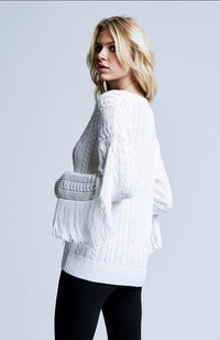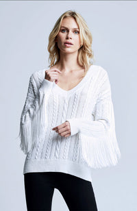 A chic V-neck sweater in a luxe cotton-wool blend and a pure ivory hue. Richly textured cable design features artful sleeve fringe that adds unexpected movement to this classic knit. Relaxed fit with V-neck.