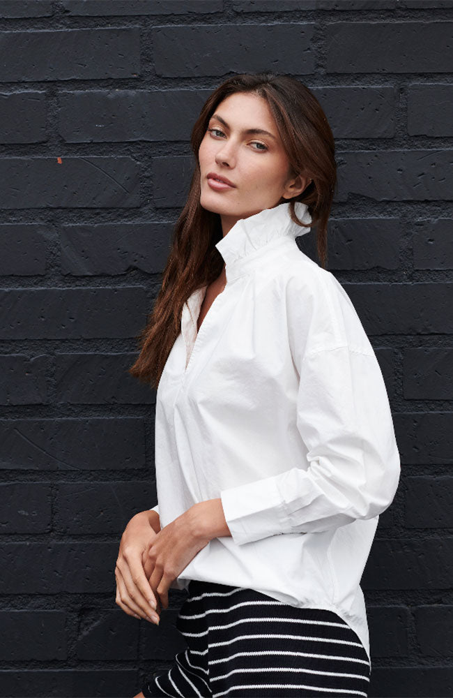 ?Tessa is the shirt of the season: a classic poplin shirt with an elevated ruffle collar and plunging v-front. It doesn't get much better than Tessa.
