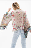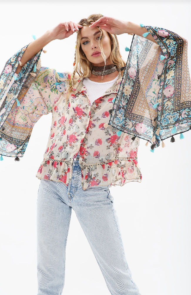 Embroidered floral print button-down blouse with ruffled hem and tasseled scarf flare sleeves