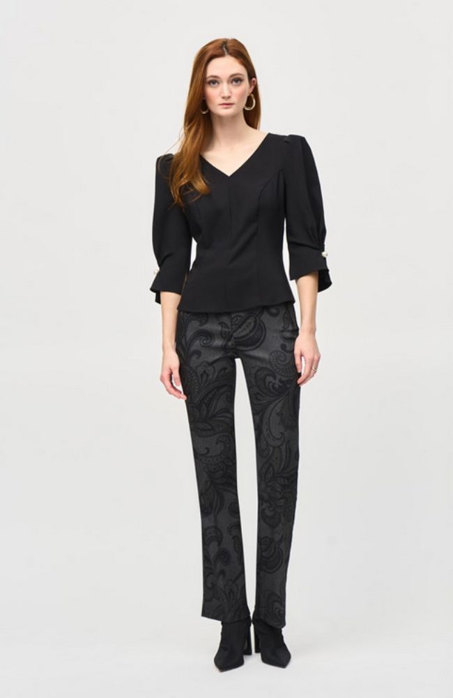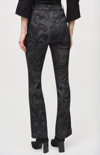 Introduce effortless sophistication into your wardrobe with these twill pull-on pants. An alluring paisley print adorns the garment, exquisitely tailored in a sleek flared silhouette. The covered elastic waistband provides a comfortable, yet, flattering fit, while the square opening pockets, back darts and faux zipper closure add a touch more of refinement to this contemporary piece.