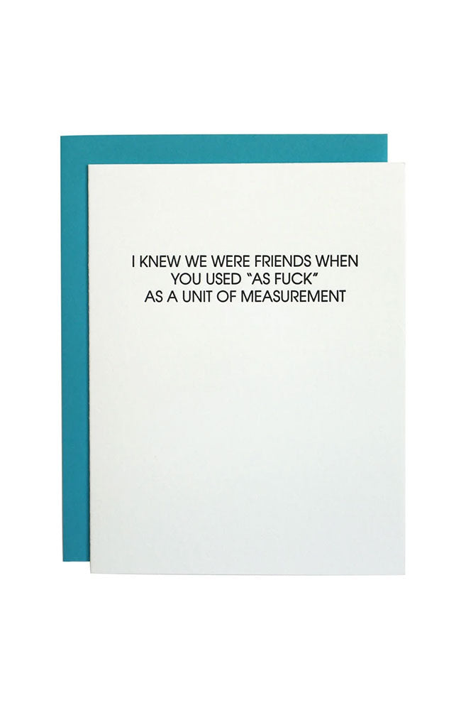 Our "Unit of Measurement As Fuck" card is letterpress printed on a vintage printing press.