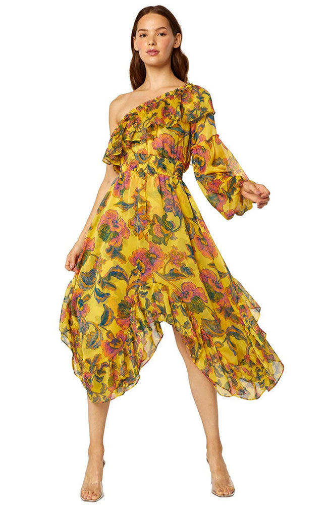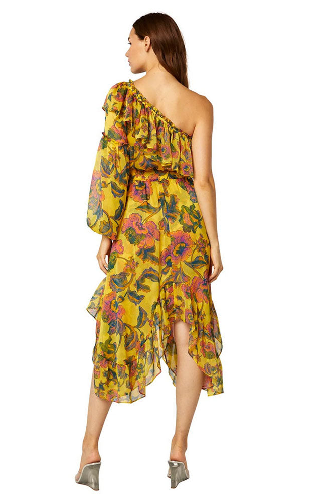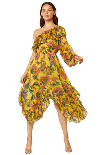 A classic style returns in a statement floral crinkle chiffon. Cut in our signature asymmetric shape, the Vola dress features a soft ruffle shoulder that leads into a slight voluminous sleeve and cascading high-low hem. A gorgeous ready-to-wear silhouette that transitions effortlessly from daytime to evening.